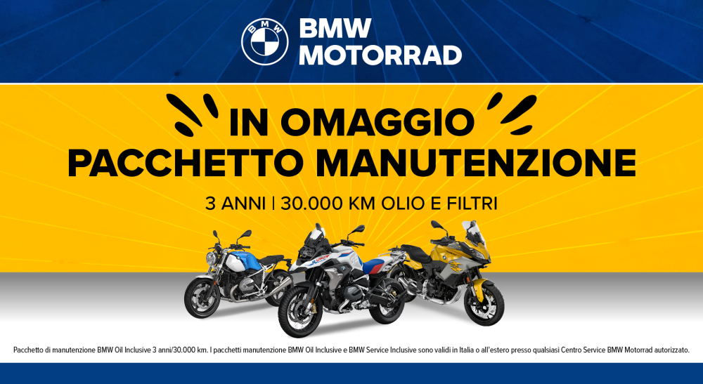 Pacchetto di manutenzione BMW Oil Inclusive 3 anni/30.000 km. I pacchetti manutenzione BMW Oil Inclusive e BMW Service Inclusive sono validi in Italia o all’estero presso qualsiasi Centro Service BMW Motorrad autorizzato.